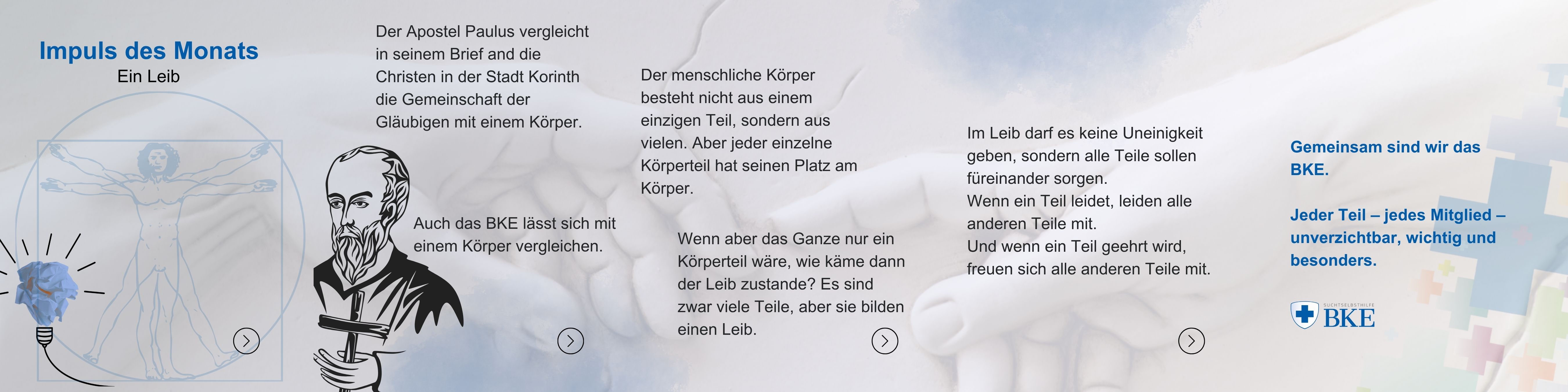 Das ist dabei herausgekommen: Mit dem BKE ist es wie beim menschlichen Körper: Er bildet eine Einheit und besteht doch aus vielen Körperteilen. Aber obwohl es viele Teile sind, ist es doch ein einziger Leib. Als ihr Teil dieses BKE wurdet, wurdet auch ihr Teil dieses Leibes.
